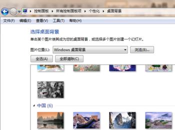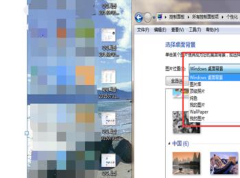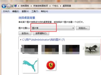 在图片设置的下拉选择框那面可以选择图片的来源,例如:图片库,我的图片,windows桌面背景等等。后面还有个浏览按钮点击即用图片路径可找到自己喜欢的图片设置为桌面背景图片。如下图所示: