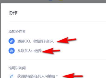 5. 最后在弹出的窗口中,根据下图箭头所指,按照需求添加协作者、复制链接邀请其他人加入即可。 -