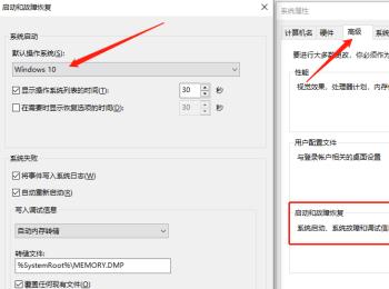3. 如图,在弹出的窗口中,下方找到启动和故障恢复栏,点击右侧的设置按钮,在弹出的窗口中,设置默认系统是win10