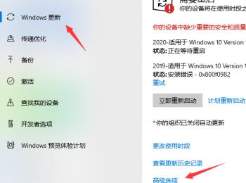 4. 在打开的更新和安全设置页面,点击左侧的“windows更新”选项,在右侧打开的页面,点击底部的“高级选项”。