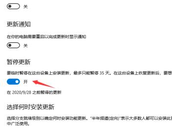 5. 如图,在打开的页面,找到暂停更新选项,将其下方的开关打开。提醒一下大家:这里的暂停仅仅可以暂停35天。35天后就会恢复更新,如果想要再次暂停,就需要先获取最新的更新。
