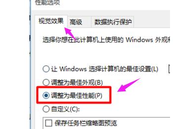 4. 在弹出的性能选项窗口中,视觉效果选项下,点选上“调整为最佳性能”