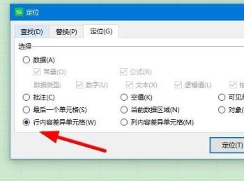 3. 在弹出的定位窗口中,点选上【行内容差异单元格】,然后点击底部的【定位】按钮。