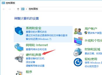 4.第四步,我们可以看到如下图所示的控制面板页面,点击箭头所指的硬件和声音选项。
