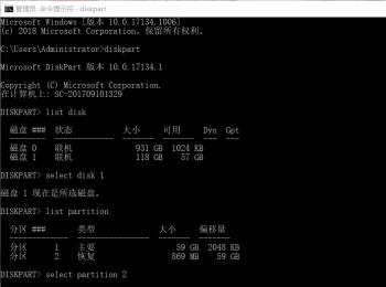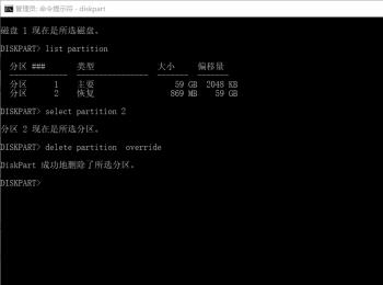 4. 最后先按照实际情况选择恢复分区,根据下图所示,小编以【selectpartition 2】为例,接着输入【delete partition override】并按下【回车】键,这样就成功删除恢复分区。