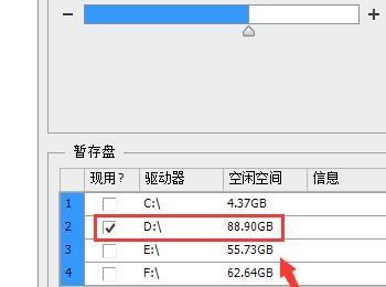 点击性能选项在弹出的对话框内我们将暂存盘设置为最大的盘符里,然后点击确定这样我们的问题就解决了,如图所示: