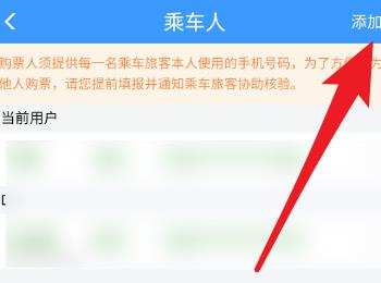 5. 进入乘车人页面后,点击右上角的【添加】按钮,将乘车人的身份证,手机号等信息添加进来