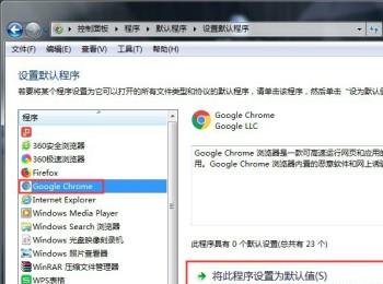 4. 第四步,我们可以看到如下图所示的设置默认程序页面,点击想要设置的浏览器,小编就选择设置谷歌浏览器为默认浏览器为例,点击页面左侧的谷歌浏览器软件,接着点击红框中的将此程序设置为默认值选项,然后点击页面底部的确定选项。
