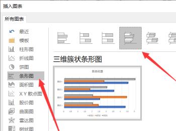 4. 第四步,随后将弹出插入图表窗口,在左侧选项条形图标签,然后在右侧选择条形图的类型,小编以三位簇状条形图为例,选择后点击下方的确定按钮。