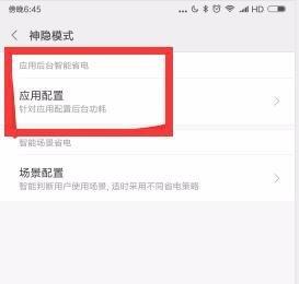 7. 选择下方的应用配置点击,就可以看到所有允许在后台运作的程序列表了,选择不常用的程序点击,然后选择智能限制后台运行或者后台运行超过十分钟后关闭选项,也可以直接选择禁止后台运行。减少手机后台程序的运行,可以降低手机的耗电。