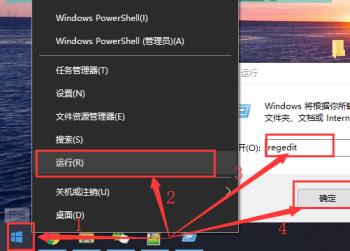 1. 首先第一步鼠标右键单击左下角【开始】图标,在弹出的菜单栏中根据下图箭头所指,点击【运行】选项,接着在方框中输入【regedit】并点击【确定】。