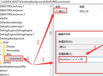 8. 第八步先点击【command】,接着根据下图箭头所指,在右侧页面中双击【默认】选项,然后将【数值数据】设置为【Shutdown -s -f -t 00】并点击【确定】。