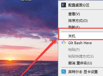 9. 第九步鼠标右键单击桌面空白处,在弹出的菜单栏中根据下图箭头所指,点击【关机】选项即可。