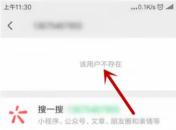 7. 最后退回主页面,在搜索框中输入手机号,根据下图箭头所指,将无法搜索到用户。