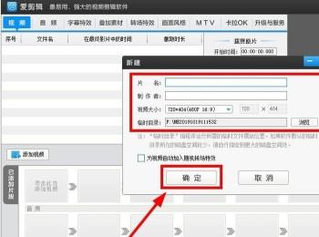 2. 如图,在弹出的“新建”窗口中,分别输入“片名”、“制作者”选择视频大小和临时目录后,点击“确定”按钮