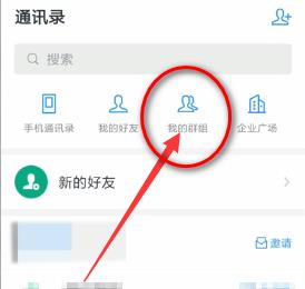 2. 第二步在【通讯录】页面中,根据下图箭头所指,点击【我的群组】选项。