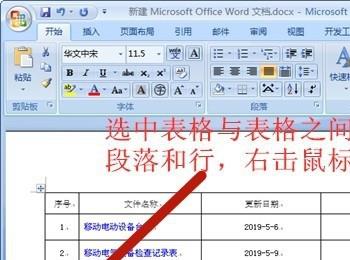 2. 第二步拆分表格后,根据下图箭头所指,先将光标定位到段落标记位置,接着按下【Delete】键。