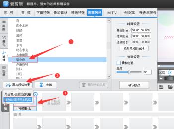3. 在打开的滤镜特效中,找到镜中像滤镜特效,选中后,点击左侧的添加风格效果按钮,在打开的菜单中,选择指定时间段添加风格的选项。