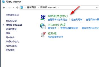 1. 首先第一步先搜索并打开【控制面板】窗口,接着根据下图箭头所指,点击【网络和Internet】选项。
