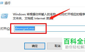 2. 第二步根据下图箭头所指,在方框中输入【devmgmt.msc】并点击【确定】选项。