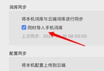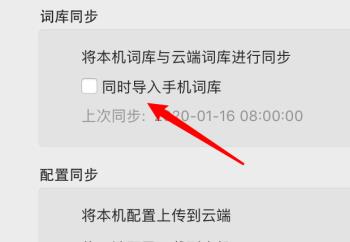 4. 将“词库同步”栏中 的“同时导入手机词库”勾选起来。