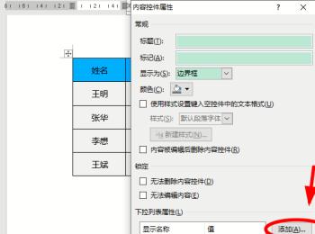 6. 如图,在弹出的【内容控件属性】窗口中,点击右下方的【添加】按钮