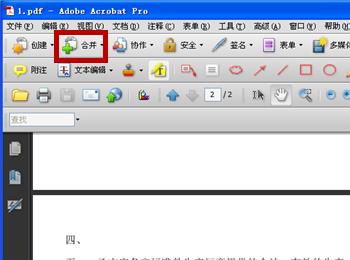 1. 打开要进行合并的一个PDF文件,在编辑器中,点击红色框的【合并】按钮,弹出窗口点击【合并文件到单个pdf】按钮
