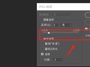 6.第六步,在下图所示的JPEG选项页面中,调低图片的品质,接着点击右上角的确定选项。