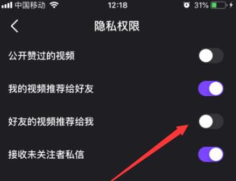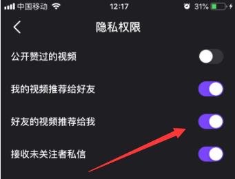 5. 第五步进入【隐私权限】页面后,根据下图箭头所指,将【好友的视频推荐给我】选项后的圆圈向左滑动,关闭该功能。