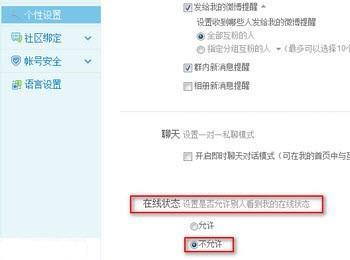 看到“个性设置”中的“在线状态”(设置是否允许别人看到我的在线状态),我们选择“不允许”:
