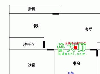 如图所示,书房外墙处是摆放无线路由器的理想位置,这样摆放能够使客厅,书房,主卧,次卧都有一个比较好无线信号。当然,不同家庭结构都不一样,大家应该视具体情况而定。一般来说,无线网卡的客户端都具备信号强度的检测能力,大家拿笔记本在房间各处查看信号强度,从而选择一个最佳的摆放点。另外也可以安装Network Stumbler软件来检测信号的强度。