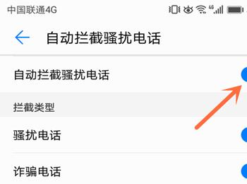 7.第七步,将自动拦截骚扰电话 右侧的开关点击打开,就成功 设置了。