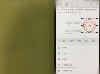 7. 最后,点击“浮于文字上方”,然后再调整一下电子印章的位置即可。