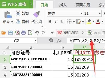 利用MID函数进行提取出正确定的日期,MID(数字串,截取开始的位置,截取的个数),就是从数字串的第七位进行提取B2/2-1位,这里是运用的四舍五入的方法,因为15位数的身份证会除不断的。