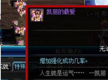 我们还可以去做任务,在称号簿中可以获得“凯丽的最爱”称号,我们佩戴这个称号,可以提高强化武器的成功几率,如图所示。