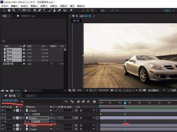 6、选择"1.jpg"层,按下T键打开【不透明度】属性,单击【不透明度】左侧的码表按钮,在当前位置设置关键帧,将时间调整到0:00:05:00帧的位置,设置【不透明度】的值为0,系统会自动添加关键帧,如下图所示。