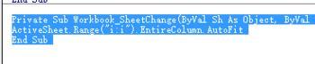 6、在thisworkbook中设置的动作不需要运行可以直接生效,我们可以现在在i列输入数据,可以看到i列自动调整了符合i列内容最长内容列宽。