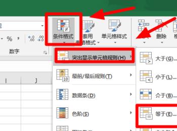 2. 第二步根据下图箭头所指,先点击【条件格式】图标,接着在弹出的菜单栏中依次点击【突出显示单元格规则-等于】选项。