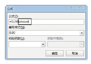 2、打开“公式”对话框,在“编号格式”下拉列表中选择公式结果的显示格式,在“粘贴函数”下拉列表中选择需要使用的函数,如图2所示。此时公式将被粘贴到“公式”文本框中,在公式的括号中输入“above”指定对当前单元格以上的数据进行计算,如图3所示。