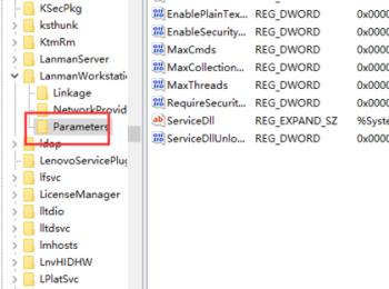 3. 展开后,找到LanmanWorkstation文件夹中的“Parameters”文件夹。