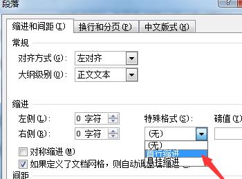 4. 第四步打开【段落】窗口后,根据下图箭头所指,点击【特殊格式】选项下的箭头图标,在弹出的下拉列表中选择【首行缩进】。