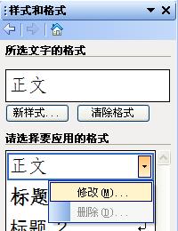 ,在程序界面的右侧任务窗格中就会显示“样式和格式”。在样式列表中找到“正文”,点击其右侧的下拉菜单,从菜单列表中选择“修改”(图1)。