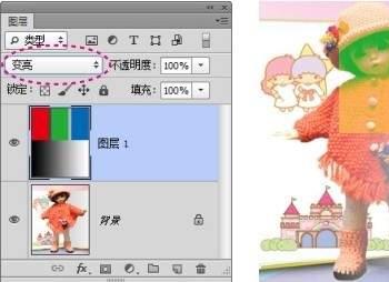 “变亮”模式的混合效果。当前图层中较亮的像素保留、较暗的像素被下层较亮的像素替换,娃娃图像便显现出来了。