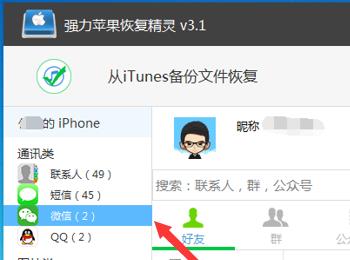 成功扫描后,点击软件界面左侧的“微信”选项,在右侧查看微信记录。