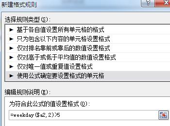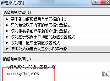 4. 第四步根据下图所示,先在方框中输入公式【weekday($a2,2)>5】,接着点击【格式】选项。