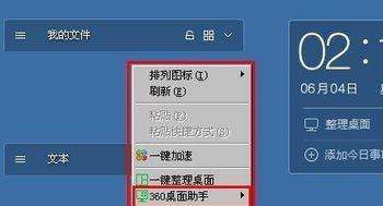 在360桌面助手打开的桌面上.点击鼠标右键。在右键下拉菜单中。可以看到360桌面助手的功能选项。我们点击这个按钮。出现了桌面出手的另一个下拉菜单。