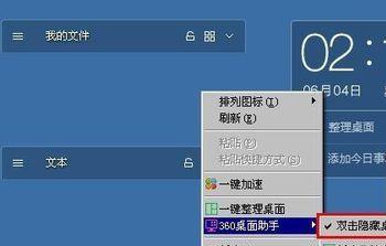 在桌面助手的空白处.点击鼠标右键出现桌面右键下拉菜单。选择菜单中360桌面助手的功能选项.双击隐藏桌面图标的功能按钮。打上对勾之后退出下拉菜单。桌面上双击鼠标左键。