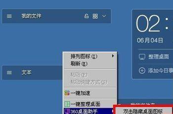 再点击桌面上360桌面助手的右键下拉菜单中。在下拉菜单中点击360桌面助手.出现了另一个下拉菜单中.可以看到双击隐藏桌面图标图标的功能按钮和选项。点击打开它。