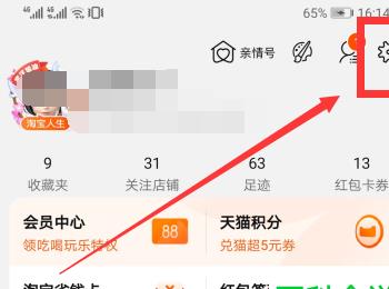 2. 进入我的淘宝页面,点击右上角的齿轮图标,进入设置。