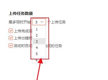 5. 第五步,来到下图所示的上传设置页面后,点击上传任务数量下面的下拉箭头,接着点击弹出窗口中想要设置的上传数量,然后点击右下角的应用选项。